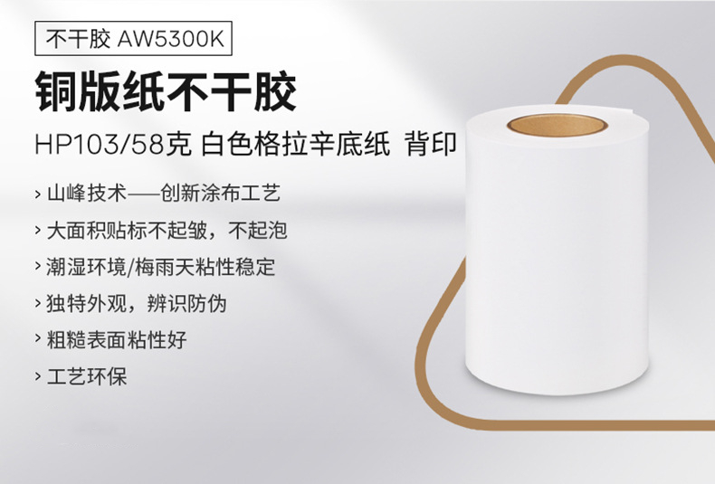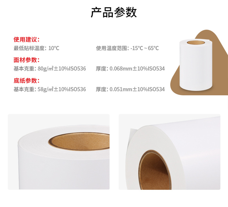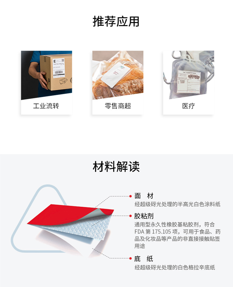 经砑光处理的半高光白色涂料纸,主要用于空白模切、条码打印应用。这是一种初始粘度与最终粘性都很高的粘胶剂。在诸多包装材料上均具有优异的表现性能。此粘胶剂符合FDA第175.105项,可用于食品、药品及化妆品等产品的非直接接触贴签用途。